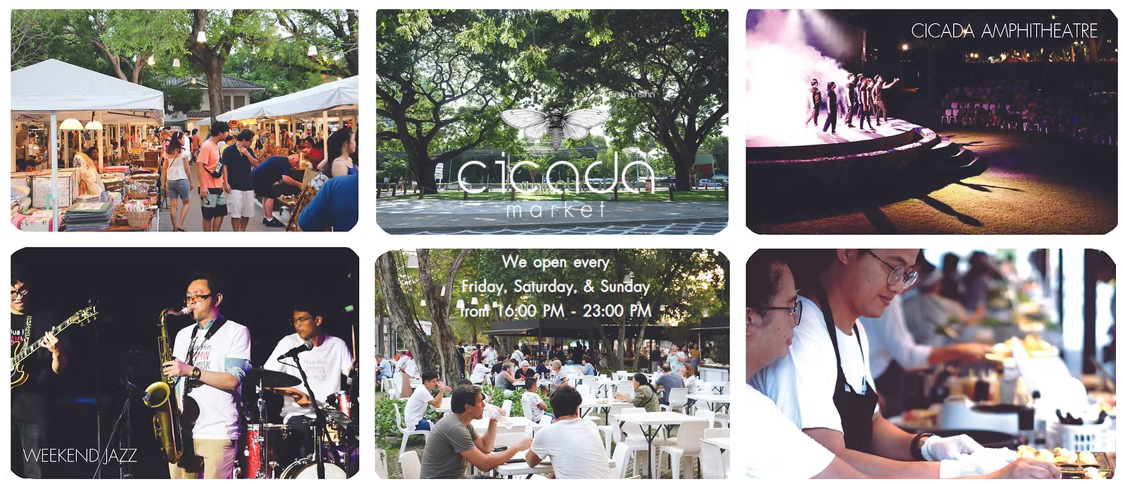 시카다 마켓에서는 라이브 음악 공연, 재즈 피아노 공연, 마술쇼, 그림자 연극 등